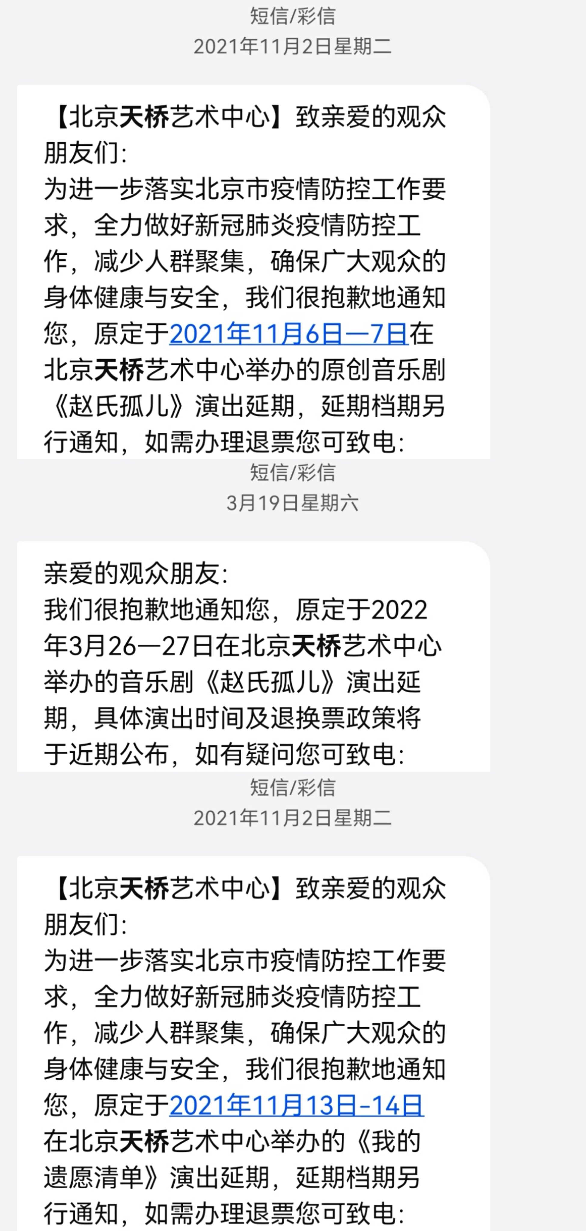 现在是2022年3月27日22:45。此刻我本应在天桥艺术中心大剧场,观看音乐剧《赵氏孤儿》因去年北京疫情而延期的第一轮巡演的大末场,按照计划演出应该刚刚结束。然而,上周收到短信通知,由于最近的疫情,本次演出再次延期。这距离开票已经过去十个月了。